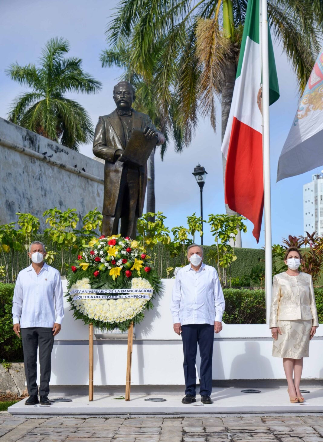 -. Con motivo del 164 aniversario de la Emancipación Política del Estado de Campeche, el gobernador Carlos Miguel Aysa González junto a su esposa Victoria Damas de Aysa, presidenta del Patronato del Sistema DIF estatal, y los titulares del Poder Legislativo y Judicial, Ramón Méndez Lanz y Miguel Ángel Chuc López, respectivamente, depositó una ofrenda floral y montó guardia de honor al pie del monumento a Don Pablo García y Montilla que se encuentra en la explanada del Congreso del Estado. Al mandatario estatal también lo acompañaron en este acto, el secretario general de Gobierno, Jorge Argáez Uribe, el titular de la Secretaría de Planeación, Tirzo García Sandoval y el secretario general del Poder Legislativo, Ramón González Flores