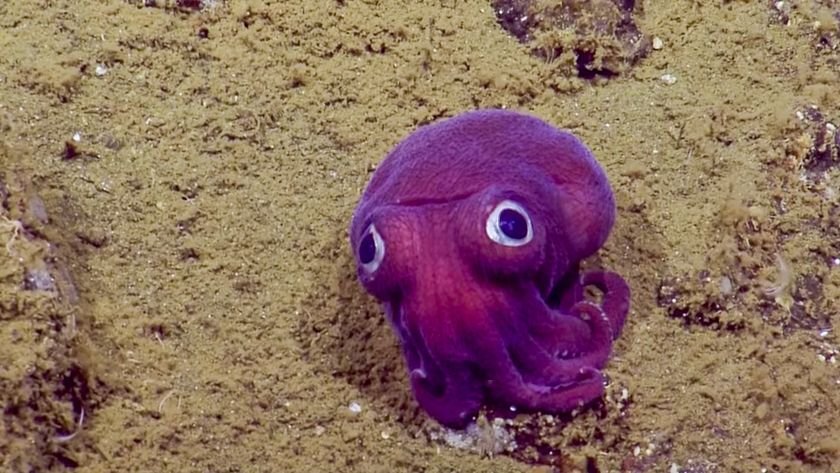 Imaginaos la escena. Un grupo de biólogos explora el lecho marino próximo a las costas de California con un submarino no tripulado controlado remotamente llamado EVNautilus. La profundidad era de unos 900 metros y sobre el lecho arenoso destacaba una extraña forma malva. El zoom de la cámara aumentó la calidad de la imagen para descubrir unaadorable criatura de ojos saltones, similar a un pulpo, que parecía haberse escapado de una película de dibujos animados.