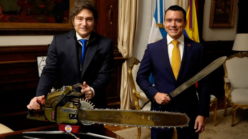 Portando elementos cargados de simbología, los presidentes de Ecuador, Daniel Noboa, y de Argentina, Javier Milei, posaron juntos en una fotografía tomada en la Casa Rosada el jueves 21 de agosto de 2025. En la imagen, que Noboa compartió en su cuenta de Instagram, Milei sostiene una motosierra con la leyenda “Las fuerzas del cielo”, mientras que Noboa empuña un machete, una herramienta de uso común en zonas rurales de Ecuador y también asociada a “recortes” o reducciones.