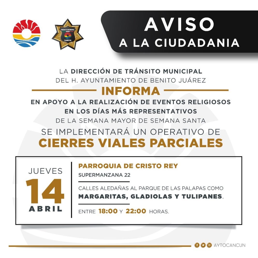 Cancún, Q.R. a 13 de abril de 2022.- El Ayuntamiento de Benito Juárez, a través de la Dirección de Tránsito Municipal, implementará un operativo de cierres parciales, en apoyo para la realización de los eventos religiosos en los días más representativos de la Semana Mayor de la Semana Santa.