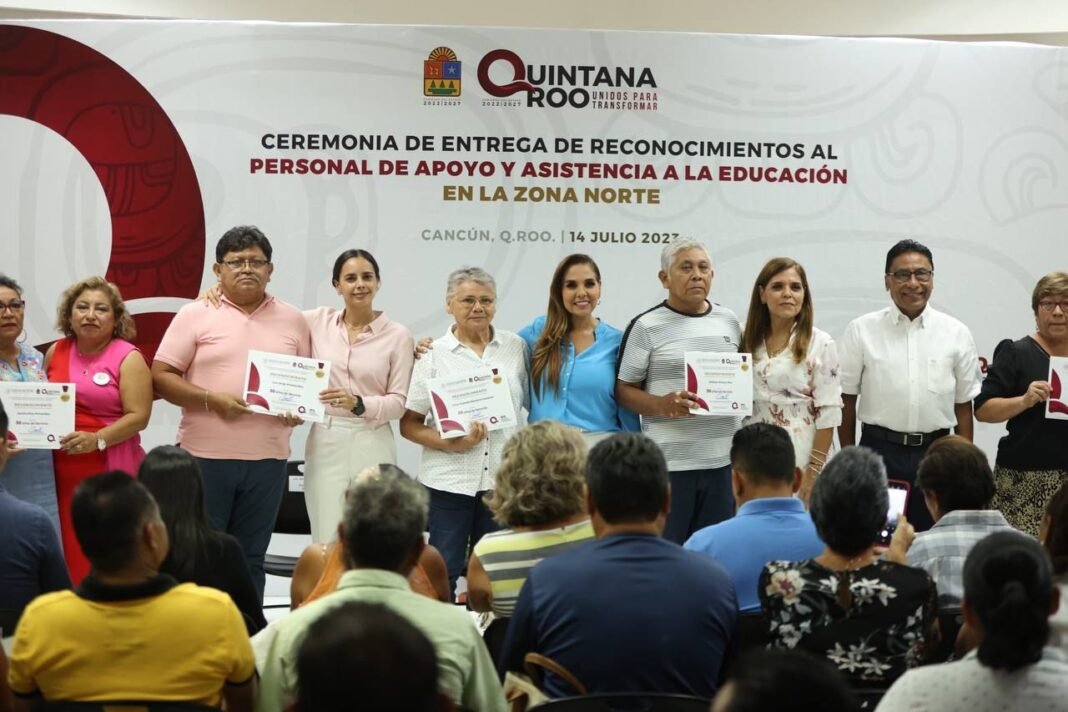 Cancún, Q. R., a 15 de julio de 2023.- En calidad de anfitriona en Cancún, la Presidenta Municipal, Ana Paty Peralta, acompañó a la gobernadora Mara Lezama a la entrega de estímulos al personal de apoyo y asistencia a la educación por 25, 30 y 35 años de servicio correspondientes a la zona norte, otorgados por los Servicios Educativos de Quintana Roo a 74 trabajadores en total.