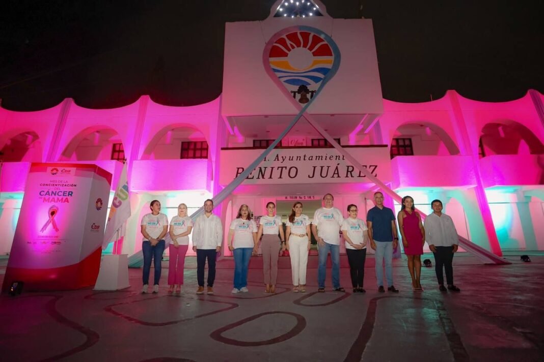 Cancún, Q. R., a 09 de octubre de 2023.- En el marco del Mes de la sensibilización contra el cáncer de mama, cáncer de ovario y cáncer cervicouterino, la Presidenta Municipal de Benito Juárez, Ana Patricia Peralta, junto a la presidenta honoraria Del Sistema DIF Estatal, Verónica Lezama Espinosa, mediante el Sistema para el Desarrollo Integral de la Familia (DIF) de Benito Juárez, realizó el evento “Cancún Rosa por las Mujeres” el cual consistió en iluminar el Palacio Municipal de color rosa y verde menta y un lazo con los mismos colores.