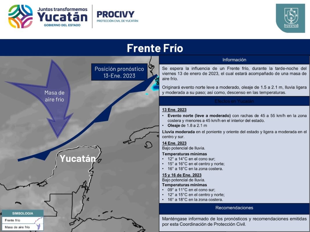 Mérida, Yucatán, 11 de enero de 2023.- Es posible que ingrese a la entidad el frente frío 23, en la tarde o noche de este viernes 13, con norte leve a moderado y descenso significativo de temperatura, entre nueve y 12 grados en el cono sur, anticipó la Coordinación Estatal de Protección Civil (Procivy).