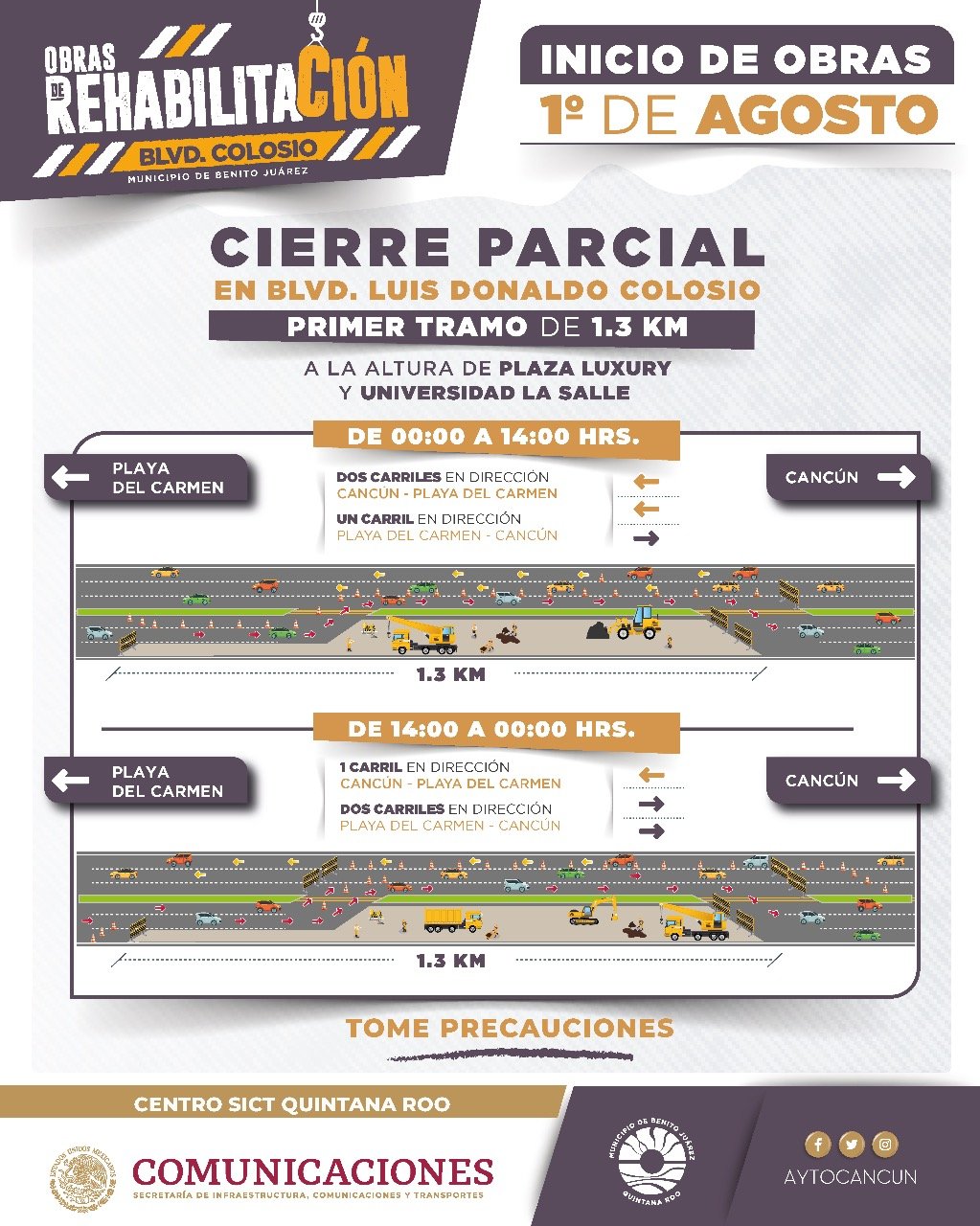 Con datos del Gobierno de México, a través de la Secretaría de Infraestructura, Comunicaciones y Transportes (SICT), el Ayuntamiento de Benito Juárez informa que a partir de este lunes 01 de agosto que inician los trabajos de rehabilitación de la carretera Mex 30 Reforma Agraria – Puerto Juárez, Tramo Boulevard Colosio, se tendrá un carril en contraflujo, un carril reversible por horarios de mayor aforo y un carril normal en la dirección del centro al aeropuerto, para garantizar el orden y seguridad de los automovilistas.