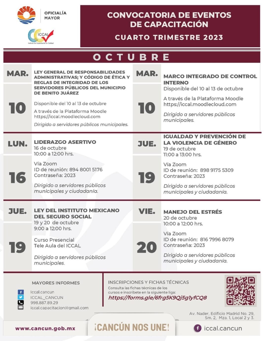 Cancún, Q. R., a 10 de octubre de 2023.- En la primera parte de octubre, el Instituto de Capacitación en Calidad (ICCAL) del Ayuntamiento de Benito Juárez contará con seis cursos gratuitos tanto para servidores públicos como para la ciudadanía en general para temas inherentes a la administración pública y habilidades para el trabajo.