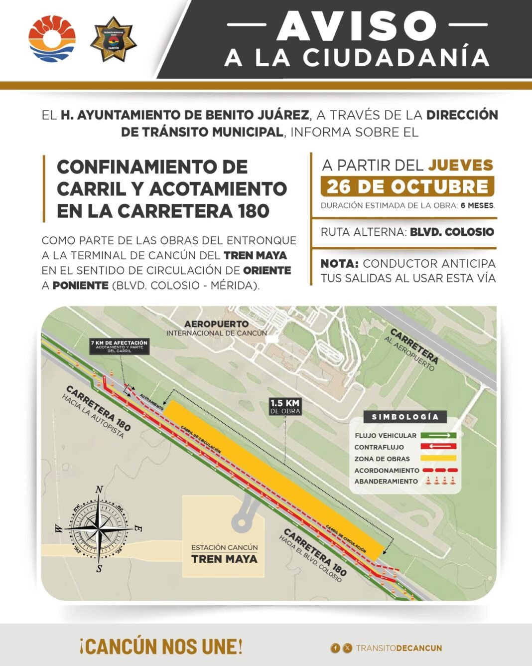 Cancún, Q. R., a 26 de octubre de 2023.- El Ayuntamiento de Benito Juárez, a través de la dirección de Tránsito Municipal, anuncia la puesta en marcha del confinamiento de carril y acotamiento en la carretera 180, que entrará en vigor desde este jueves 26 de octubre.