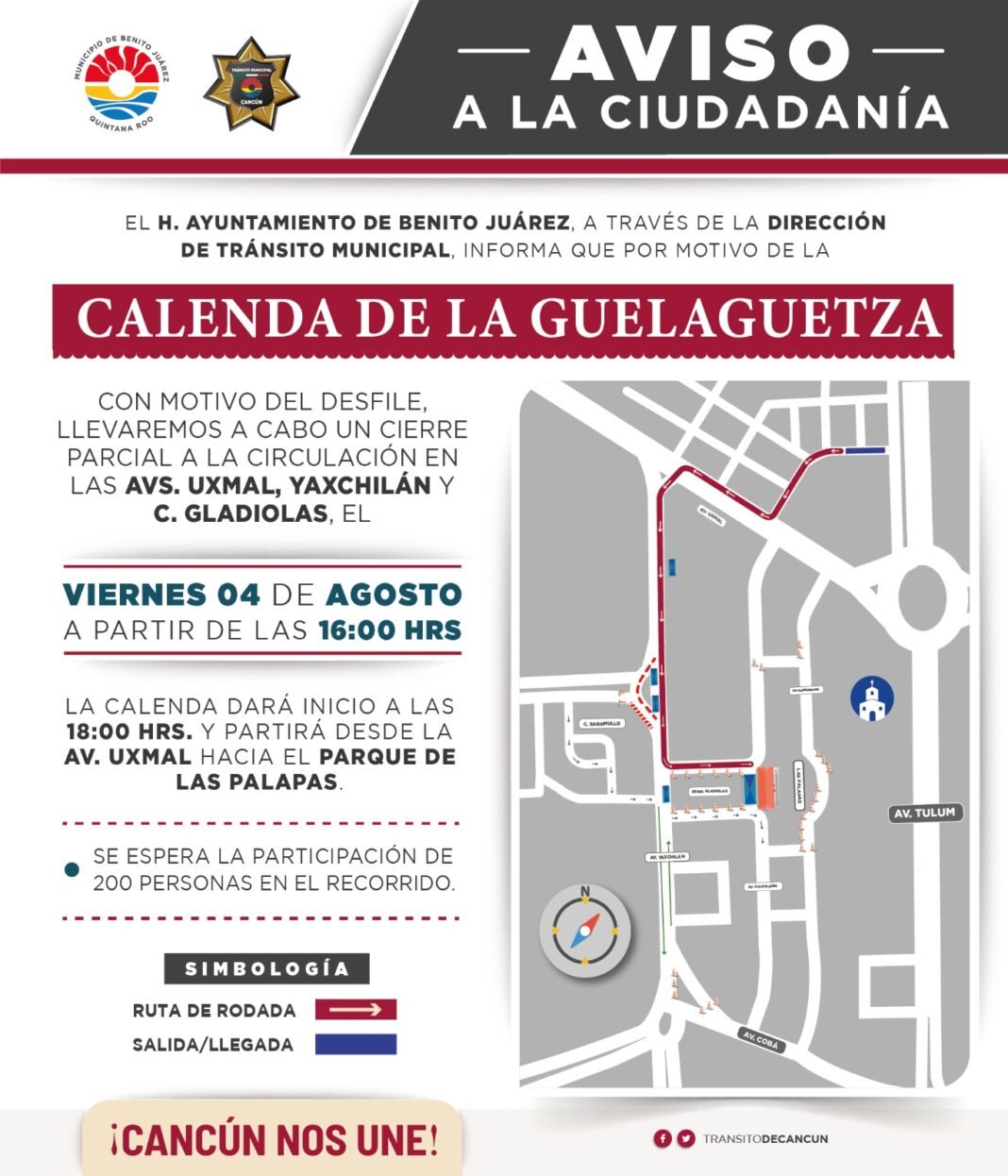Es importante hacer mención que el día 04 también se realizará el recorrido “La Calenda de la Guelaguetza Cancún 2023”, y dará inicio a las 18:00 horas frente al ADO, para tomar la Av. Uxmal con dirección hacia la Av. Yaxchilán e incorporarse en sentido contrario a la Av. Yaxchilán para avanzar sobre calle Gladiolas y llegar a espaldas del escenario del Parque de las Palapas, donde finalizará el recorrido. Durante dicho trayecto, personal de Tránsito Municipal acompañará al contingente, cerrando parcialmente las vialidades antes mencionadas, hasta concluir la movilización.