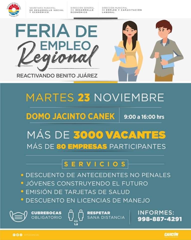 Cancún, Q.R., a 22 de noviembre de 2021.- Con más de 3 mil vacantes para ofertar, este martes 23 de noviembre se realizará la primera Feria del Empleo Regional en el Domo Jacinto Canek, donde los participantes también podrán encontrar descuentos en tarjeta de salud y antecedentes no penales.