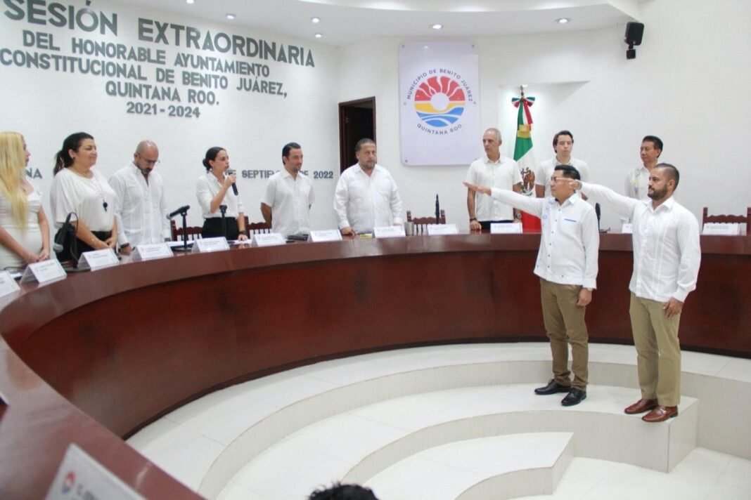 Cancún, Q.R., a 27 de septiembre de 2022.- Durante la Décimo Novena Sesión Extraordinaria, el Cabildo de Benito Juárez aprobó la propuesta y tomó la protesta de ley a Jorge Carlos Aguilar Osorio, como Secretario General del Ayuntamiento, así como a los regidores Luis Alberto Pech Pech y Julio de Jesús Méndez Paniagua, que se integran por suplencia a dicho cuerpo colegiado.