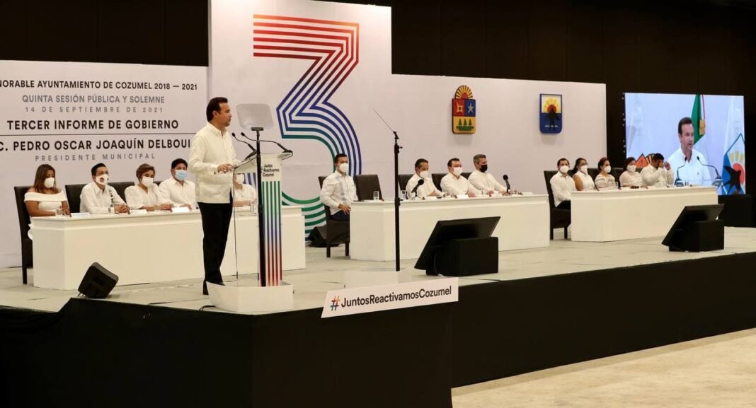 Cozumel. – El gobernador Carlos Joaquín acompañó a Pedro Joaquín Delbouis, presidente municipal de Cozumel, y presenció el Tercer Informe de Gobierno.
