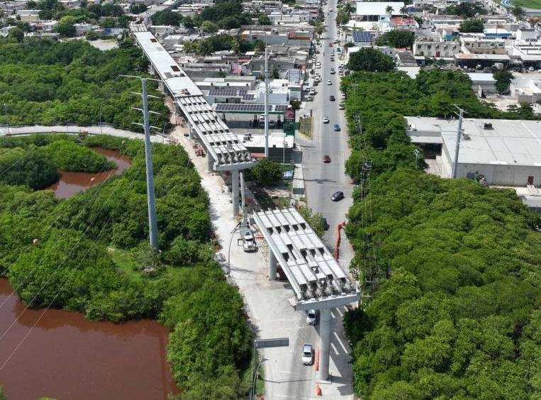 La estructura del viaducto comprende 46 apoyos en la ciudad y 12 en la zona del estero. Además, se está avanzando en la construcción de terraplenes que conectarán con la carretera Mérida-Progreso. Las cuadrillas de trabajadores continúan con el colado de la calzada en áreas donde ya se montaron las trabes.