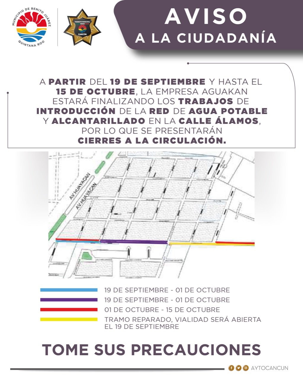El H. Ayuntamiento de Benito Juárez informa que a partir del 19 de septiembre, la empresa concesionaria Aguakan, estará finalizando los trabajos de introducción de la red de agua potable y alcantarillado en la Calle Álamos, por lo que se presentarán cierres a la circulación.