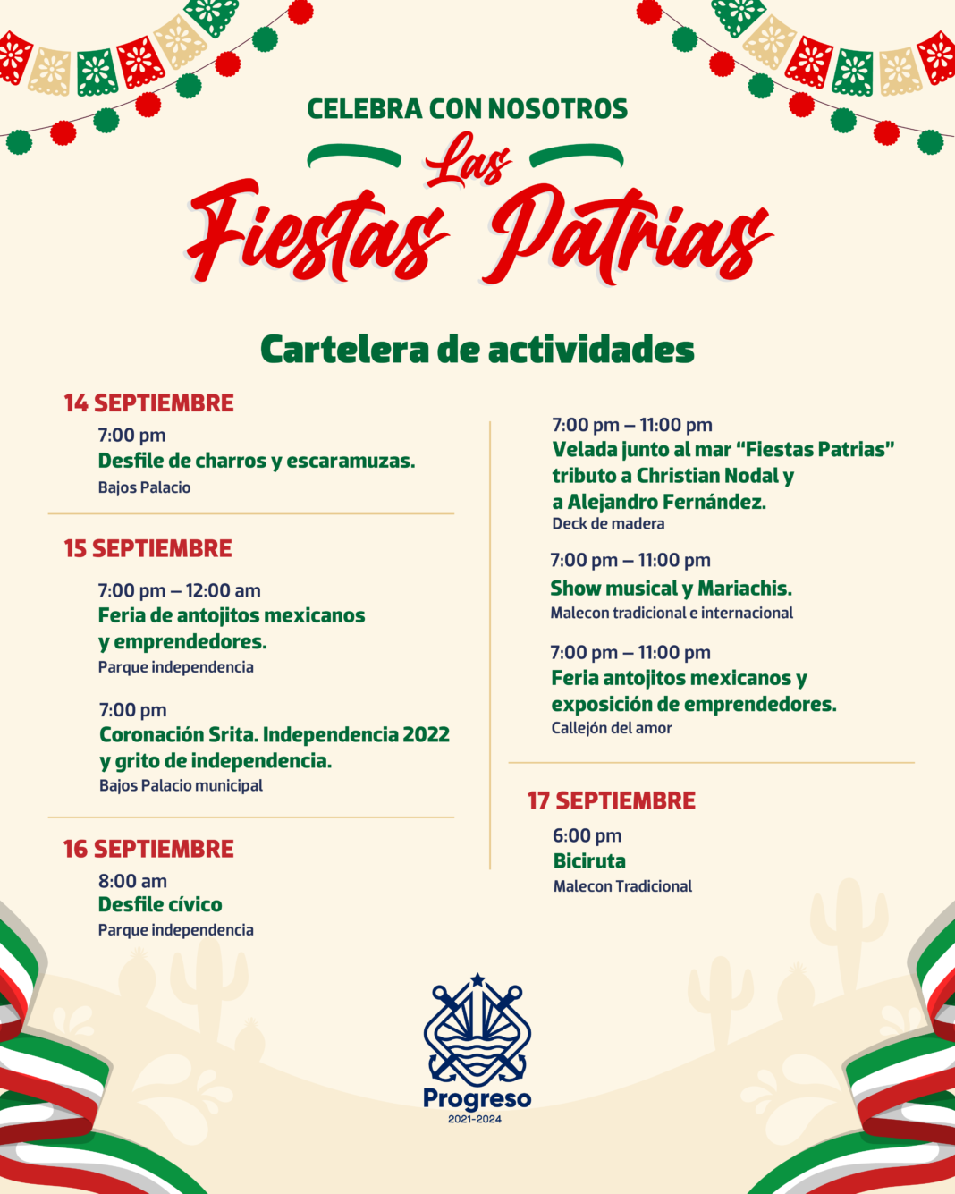 PROGRESO, 12 de septiembre. – El H. Ayuntamiento que preside el alcalde Julián Zacarías Curi, invita a la ciudadanía a asistir a los eventos que el Comité Organizador tiene programado con motivo de los festejos del mes patrio.