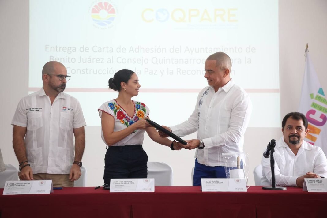 Cancún, Q.R., a 30 de enero de 2023.- La Presidenta Municipal, Ana Patricia Peralta, entregó la carta de adhesión del Ayuntamiento de Benito Juárez al Consejo Quintanarroense para la Construcción de la Paz y la Reconciliación (COQPARE), con lo que se convierte en el primer municipio en sumarse a esa estrategia para trabajar en programas y acciones de manera conjunta.