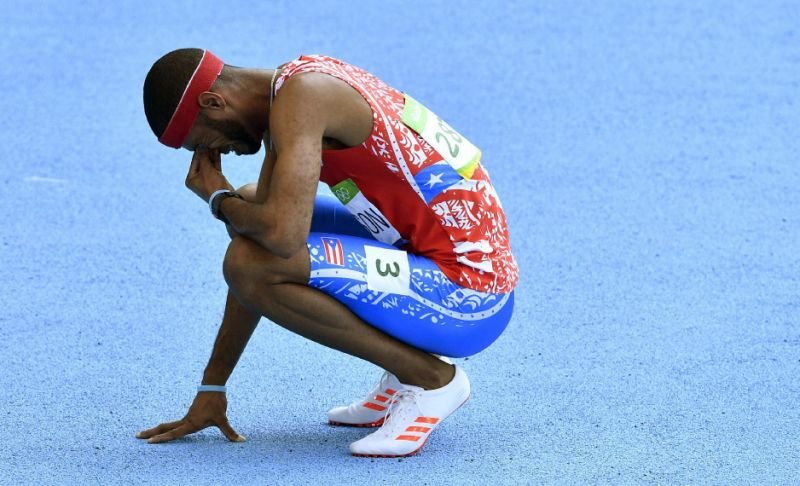El boricua tuvo una falsa salida y quedó eliminado el jueves de la competencia por las medallas en los 400 metros con vallas de los Juegos Olímpicos de Río.