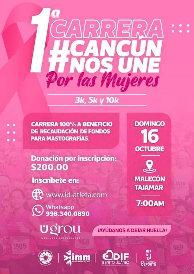 La primera autoridad municipal detalló que esta carrera pedestre se realizará en el marco del Día Mundial de la Lucha Contra el Cáncer de Mama, que se conmemora el 19 de octubre y además tendrá una causa social, ya que todo lo que se recaude en las inscripciones, se donará para la realización de mastografías a mujeres cancunenses en la Clínica Salud Digna.