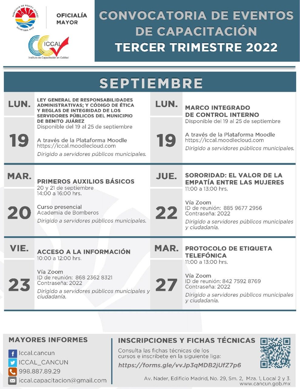 De igual forma, para ellos se encontrarán disponibles dos importantes cursos a través de la Plataforma Moodle del ICCAL, tales como: “Ley General de Responsabilidades Administrativas; y Código de Ética y Reglas de Integridad de los Servidores Públicos del Municipio de Benito Juárez”, del 19 al 25 de septiembre