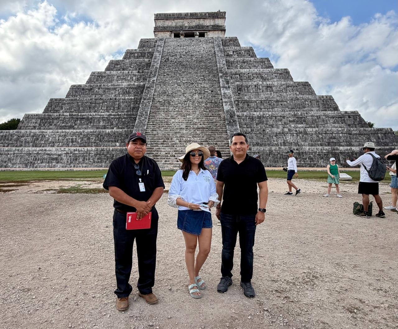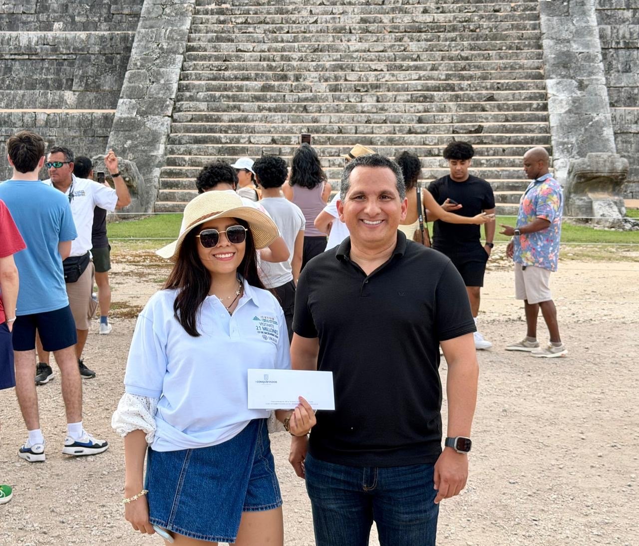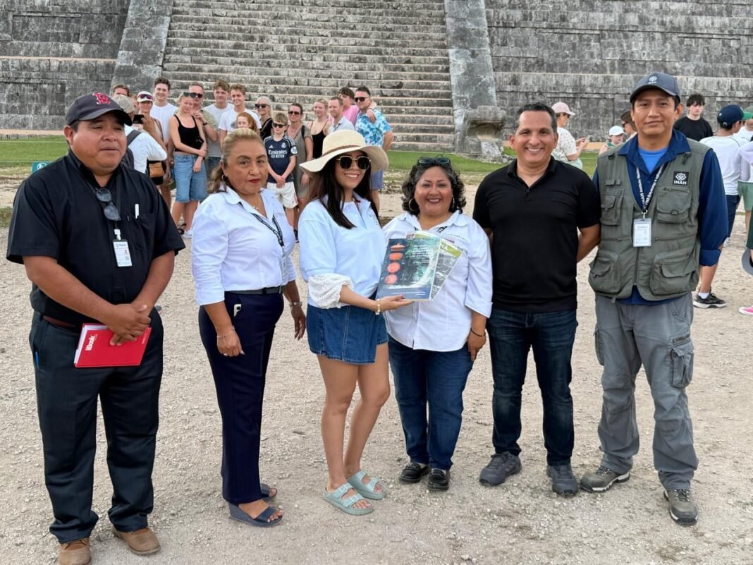 En sencillo acto, Jairo Suaste Salazar, director jurídico de la zona arqueológica, y Jorge Carrillo Sáenz, presidente del Consejo Empresarial Turístico de Yucatán, recibieron a la joven en el parador turístico, le entregaron la camiseta conmemorativa y la acompañaron en una visita guiada por la ciudad sagrada, así como por el Museo de Chichén Itzá, ubicado en el Centro de Atención a Visitantes.