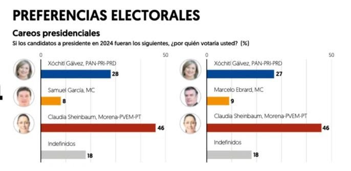 Sheinbaum, como abanderada de la coalición Morena-PVEM-PT, cuenta con 46 por ciento de las preferencias, mientras que Gálvez capta 28 por ciento; Samuel García, como posible abanderado de MC, 8 por ciento, con 18 por ciento de indefinidos. En un escenario con Marcelo Ebrard como la opción naranja, Sheinbaum confirma 46 por ciento de apoyo, Gálvez cuenta con 27 por ciento y Ebrard, con 9 por ciento, nuevamente con 18 por ciento de indefinidos. En este segundo escenario, la ventaja de Sheinbaum sobre Gálvez es de 19 puntos.