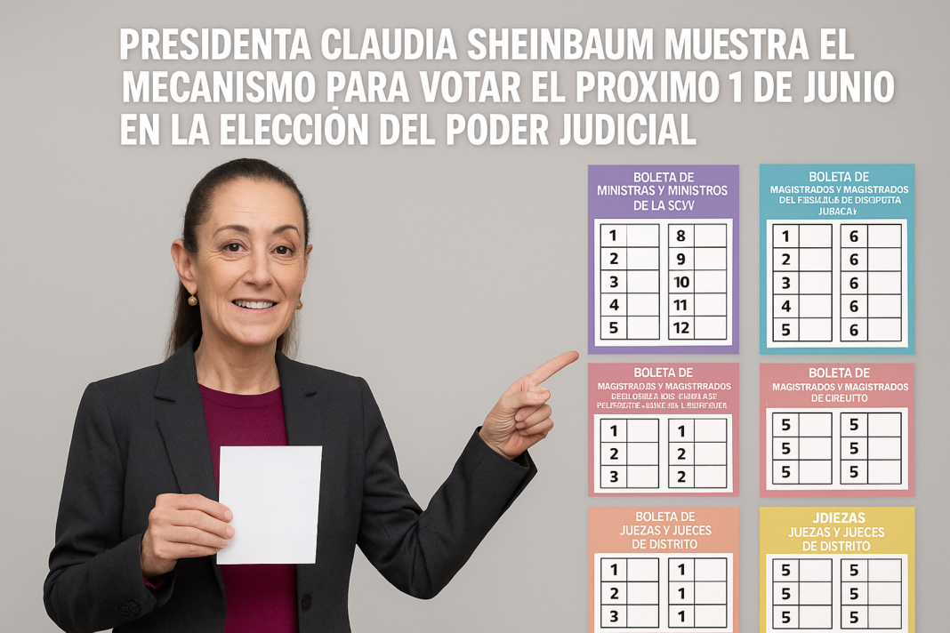 Ciudad de México, a 14 de mayo de 2025. La presidenta de México, Claudia Sheinbaum Pardo, dio a conocer a través de sus redes sociales el mecanismo mediante el cual las y los ciudadanos podrán ejercer su voto en las históricas elecciones del próximo 1 de junio, donde por primera vez se elegirá de forma democrática a ministras, ministros, juezas, jueces, magistradas y magistrados del Poder Judicial de la Federación.