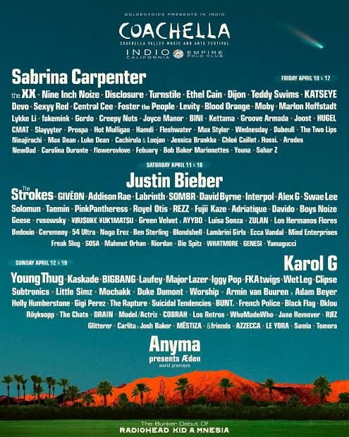 Una de las novedades que más captan la atención es Radiohead. Pero ojo: no será un concierto estándar. Aparece en el cartel bajo la mención de “Kid A Mnesia”, lo que sugiere una exposición o experiencia audiovisual, no una presentación en vivo de la banda como tal. Se especula que será más bien una instalación, exposición o experiencia inmersiva en búnker, quizá con arte visual, que se monta en el desierto de California.