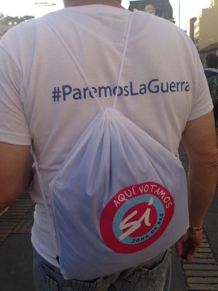 A otro costado de la céntrica plaza bogotana, estaba Blanca Naranjo, una mujer adulta que se acercó vestida con una camisa blanca con un dibujo de una paloma del mismo color y la palabra Sí. Las consecuencias de la guerra no las ha recibido directamente pero dice que sufre cada vez que ve a otros compatriotas padecer. “Estamos cansados de tanta violencia. Y creo que este es el comienzo para una nueva Colombia”.