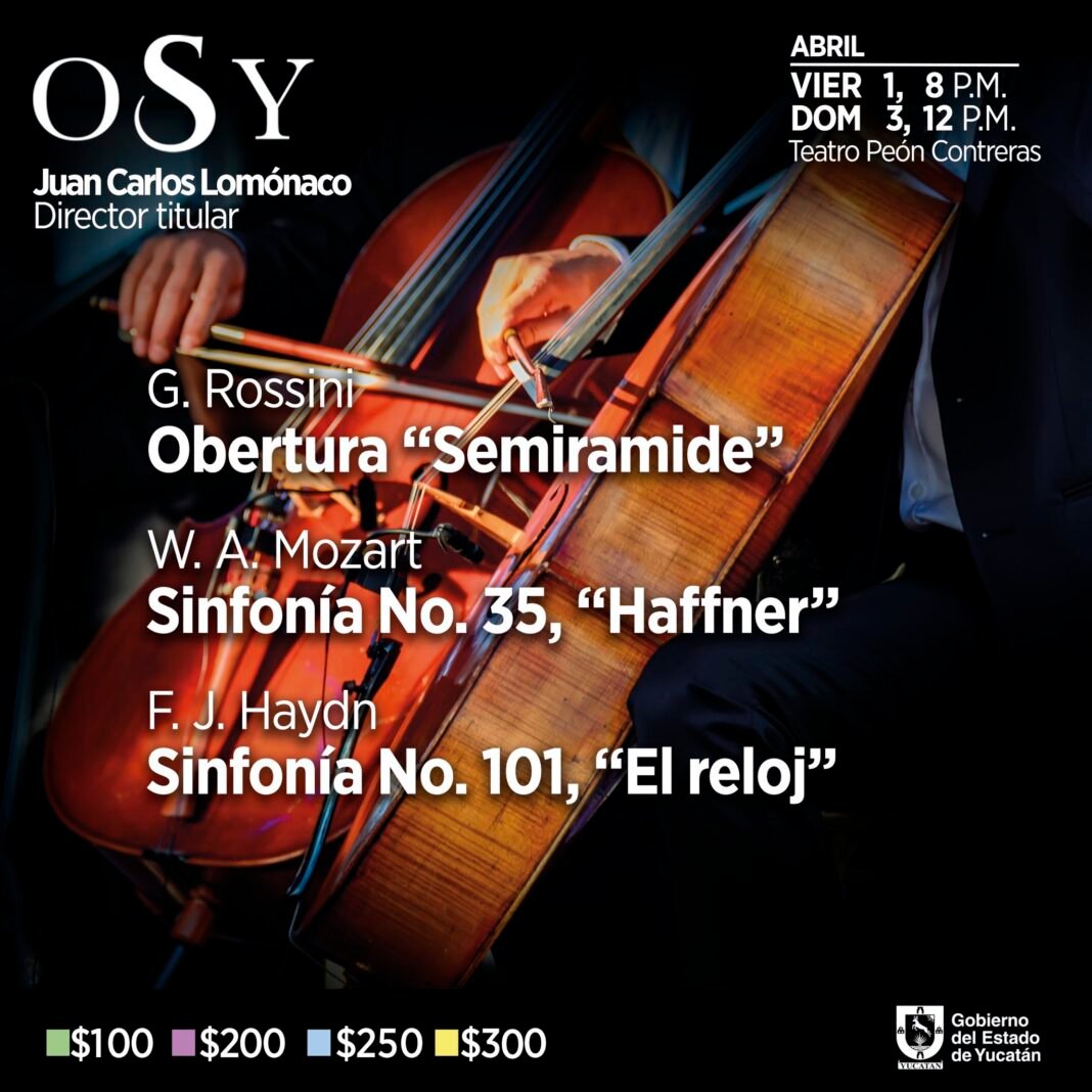 Bajo la batuta del maestro Juan Carlos Lomónaco, la OSY interpretará la Obertura “Semiramide” de Rossini, la Sinfonía No. 35, “Haffner” de Mozart y la Sinfonía No. 101, “El reloj” de Haydn los días 1 y 3 de abril a las 20:00 y 12:00 horas, respectivamente, en el Teatro Peón Contreras de esta ciudad.
