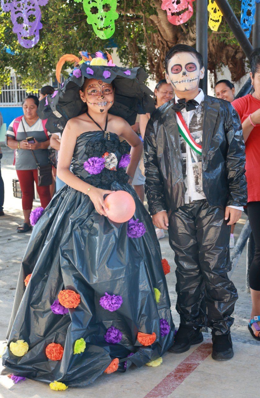 En la amena pasarela en el patio de la escuela y al ritmo de la música, los alumnos de primaria alta que comprende los grados 4°, 5° y 6°, mostraron las caracterizaciones de sus catrinas y catrines de personajes emblemáticos en la historia de México como Frida Kahlo, Benito Juárez, Francisco Villa, Diego Rivera, por mencionar algunos, con sus respectivos atuendos de material reciclado que elaboraron junto con sus padres.