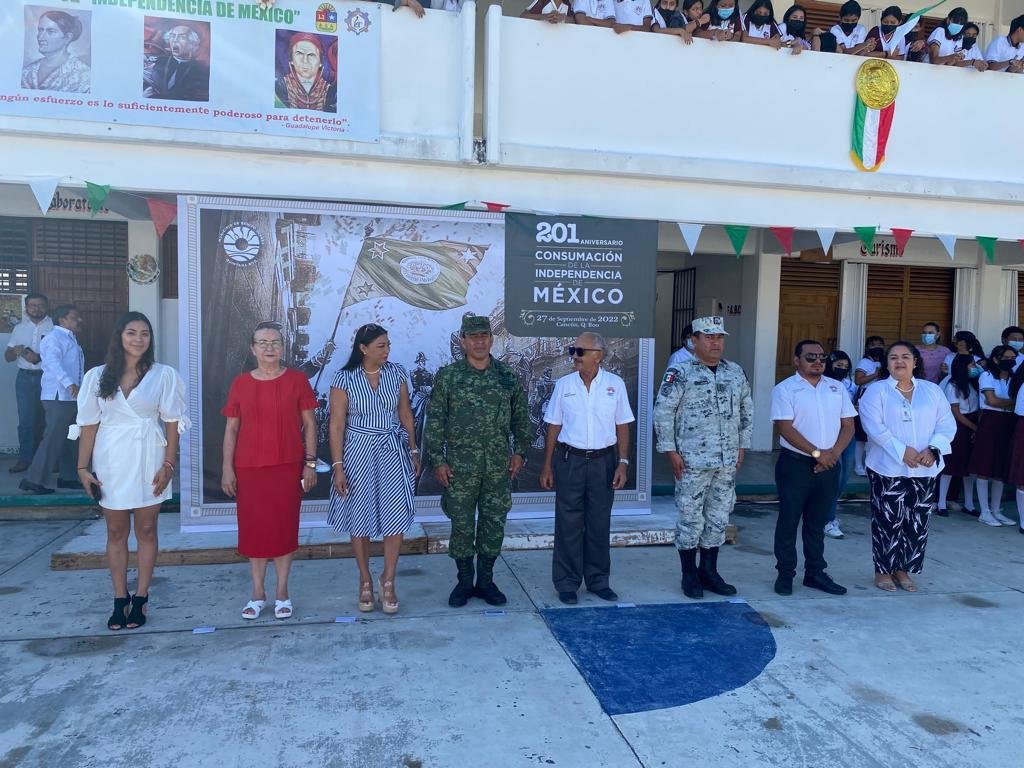 Cancún, Q.R., a 27 de septiembre de 2022.- Ante la bandera de México en lo más alto, en la Escuela Secundaria Técnica No. 32 “Independencia de México”, autoridades municipales, estatales y federales, realizaron una ceremonia cívica conmemorando el 201 Aniversario de la Consumación de la Lucha de Independencia.