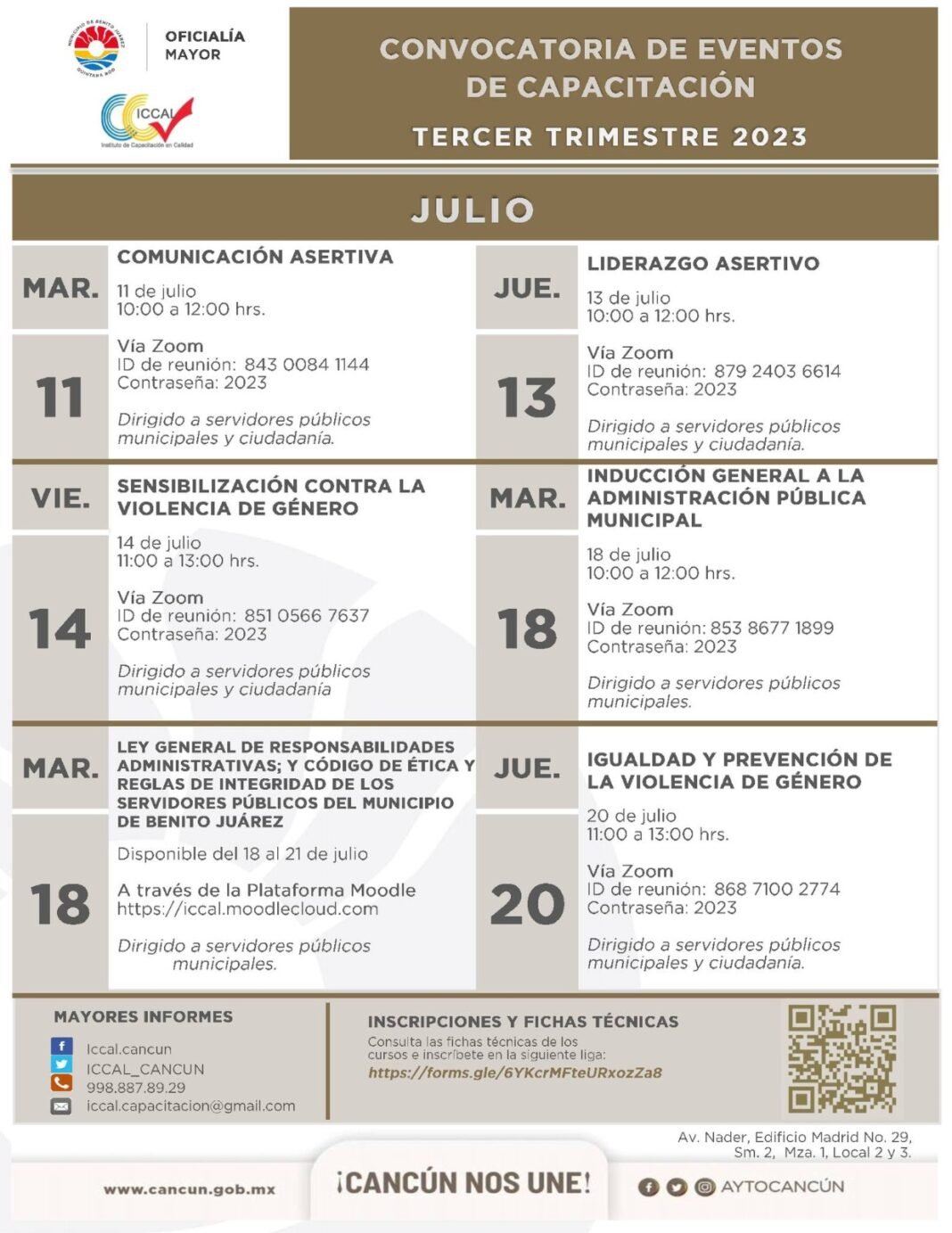 En última instancia durante la primera parte del mes, exclusivamente para los servidores públicos, se ofrecerán dos capacitaciones que son: “Inducción general a la administración pública municipal”, el 18 de julio de 10:00 a 12:00 horas por Zoom; y “Ley general de responsabilidades administrativas; y Código de ética y reglas de integridad de los servidores públicos del municipio de Benito Juárez disponible en la Plataforma Moodle del 18 al 21 de julio.