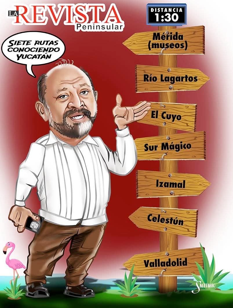 Darío Flota, secretario de Turismo de Yucatán, aparece señalando las siete rutas emblemáticas para descubrir el estado: Mérida (museos), Río Lagartos, El Cuyo, Sur Mágico, Izamal, Celestún y Valladolid. Con un tono amigable la imagen promueve el turismo local con un mensaje claro: conocer Yucatán es descubrir su diversidad natural, histórica y cultural.