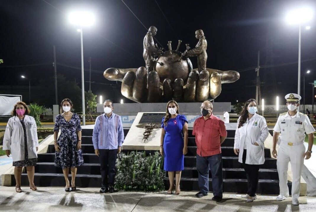 Cancún, Q.R., a 22 de octubre del 2021.- Por su labor, profesionalismo y calidad humana sobre todo en la pandemia por COVID-19, autoridades estatales y municipales realizaron en Cancún un homenaje y develaron un monumento al personal médico de Quintana Roo, previo al Día del Médico que se conmemora en el país cada 23 de octubre.