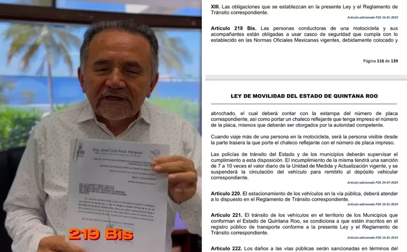 El diputado José Luis Pech Várguez, del partido Movimiento Ciudadano, presentó una iniciativa para derogar la denominada “ley chaleco” en Quintana Roo. Sin embargo, la propuesta se basa en la eliminación del artículo 219-Bis de la Ley de Movilidad del estado, el cual no existe en dicha legislación.