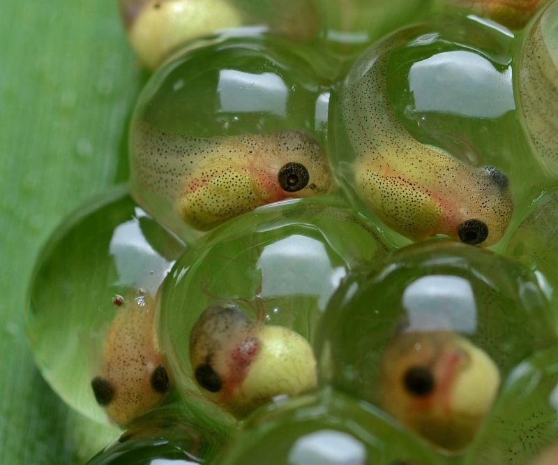 Los embriones de la rana verde de ojos rojos (Agalychnis callidryas) tienen una especie de super-poder que les salva la vida en muchas ocasiones. Al igual que el piloto de un caza puede eyectarse de la cabina cuando las cosas se ponen muy mal, los renacuajos de esta especie de rana arborícola pueden forzar su eclosión a voluntad. ¿Que los racimos de huevos que su madre deposita sobre una hoja suspendida sobre la charca son atacados por serpientes o avispas? pues los renacuajos “aprietan” el botón de eyección y salen del huevo en cuestión de segundos. ¡Asunto arreglado!