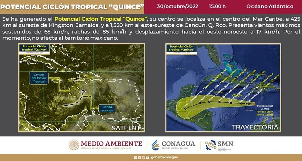 Cancún, Q. R., a 30 de octubre de 2022.- El Ayuntamiento de Benito Juárez, a través de la Dirección de Protección Civil, informa a la ciudadanía las actuales condiciones climatológicas en el estado y el potencial desarrollo del ciclón tropical “Quince” en la porción central del Mar Caribe.