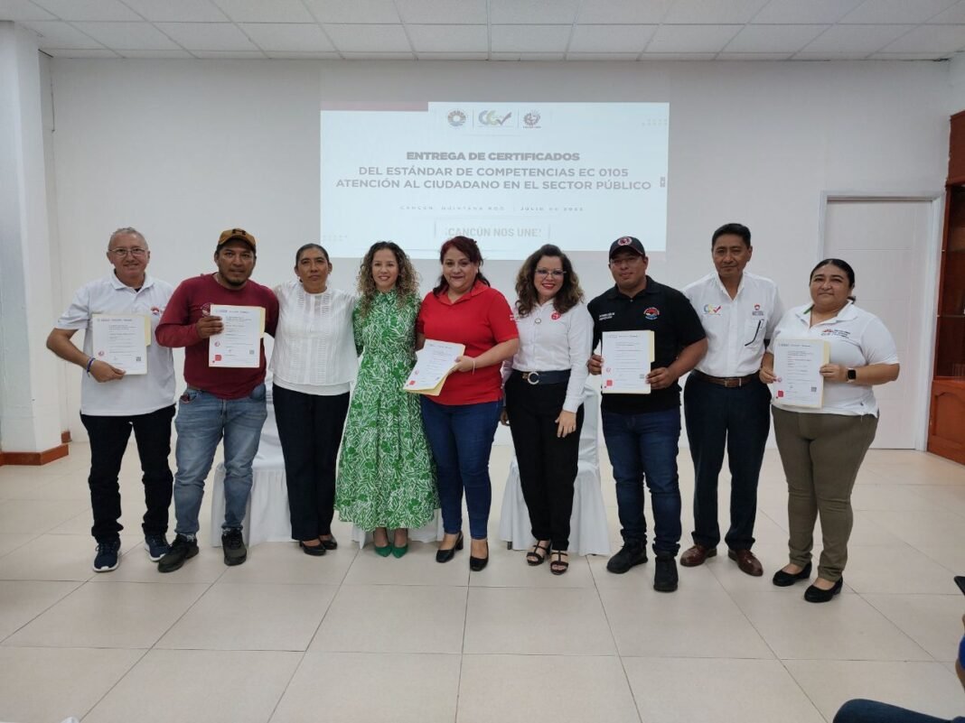 Cancún, Q. R., a 30 de julio de 2023.- De continuidad con el compromiso con la certificación y profesionalización de los servidores públicos del Ayuntamiento de Benito Juárez, el Instituto de Capacitación en Calidad (ICCAL) entregó los certificados del Estándar de Competencias EC 0105 “Atención al ciudadano en el sector público”, a 60 colaboradores de diferentes áreas, que representan el cuarto bloque de beneficiados con este programa iniciado desde 2020.