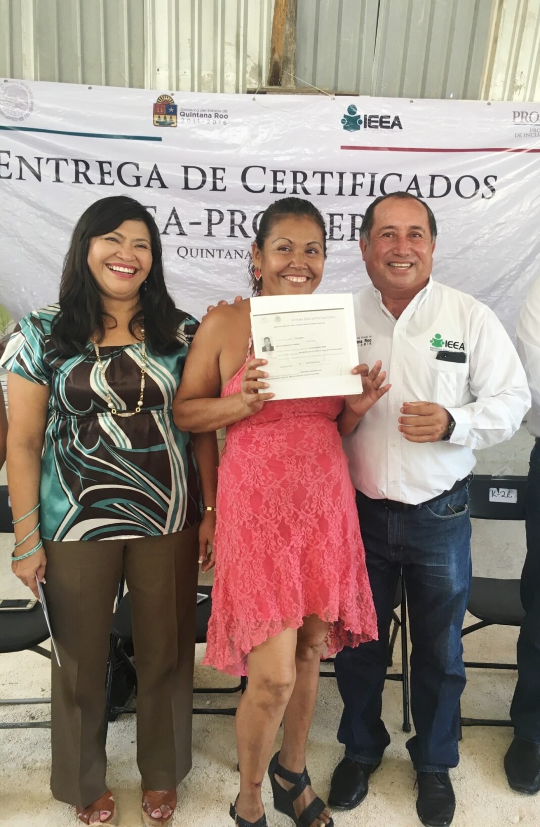 CANCÚN, Quintana Roo, 25 de agosto.— El Instituto Estatal para la Educación de los Jóvenes y Adultos (IEEA) entregó este jueves 132 certificados del Programa Especial de Certificación (PEC), a beneficiarias del Programa Prospera, en un evento que encabezó el director general del IEEA, Javier Novelo Ordóñez, en la colonia Valle Verde.