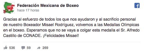 “Gracias al esfuerzo de todos los que nos ayudaron y al sacrificio personal de nuestro boxeador Misael Rodríguez volvemos a las Medallas Olímpicas. Esperamos que no se vaya a colgar la medalla el sr. Alfredo Castillo, de Conade”, se leyó en la publicación en la red social.