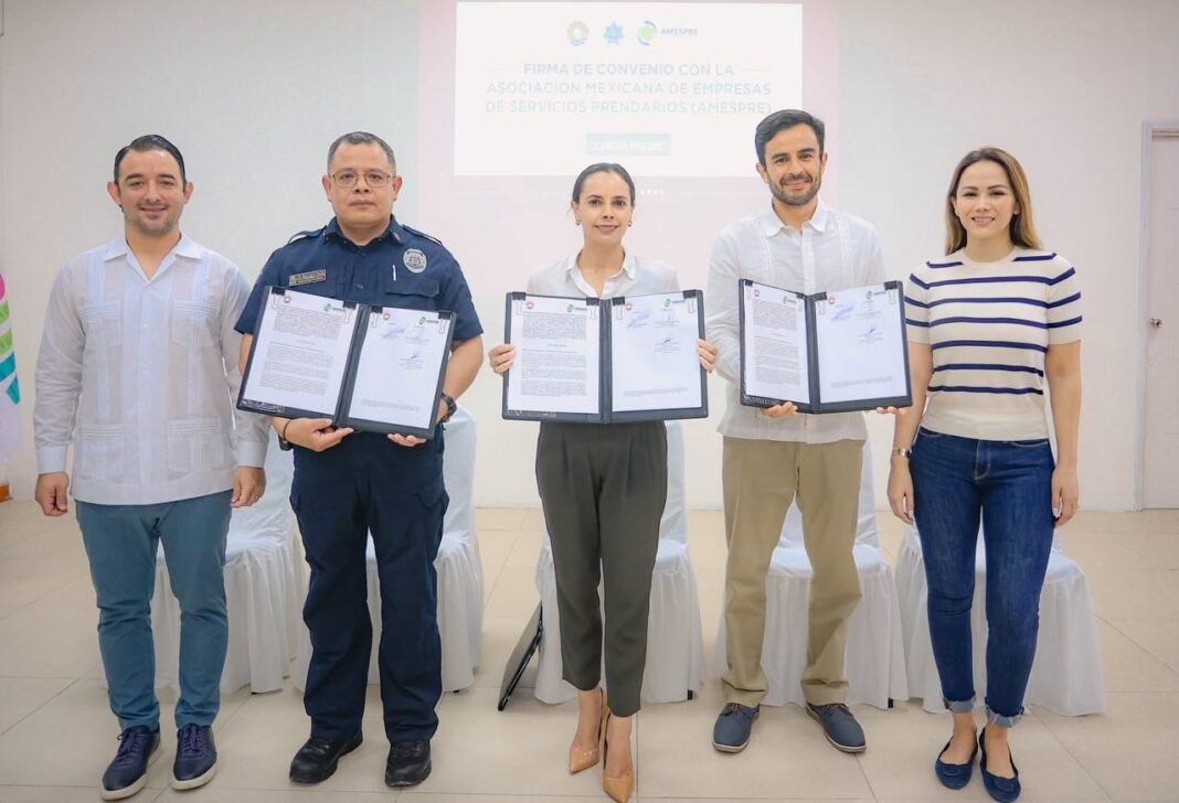 Cancún, Q. R., a 13 de octubre de 2023.- Con el objetivo de fortalecer la seguridad, la prevención de los delitos y la cultura de paz en Cancún, la Presidenta Municipal, Ana Patricia Peralta, encabezó la firma de convenio entre la Asociación Mexicana de Empresas de Servicios Prendarios (AMESPRE A.C) y la Secretaría Municipal de Seguridad Ciudadana y Tránsito, realizada en el Salón Presidentes del Palacio Municipal.