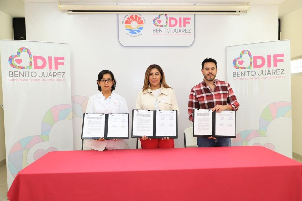 Cancún, Q.R., a 23 de octubre de 2022.- Con el objetivo de fortalecer los servicios médicos y psicológicos que se otorgan dentro de la institución, el Sistema DIF Benito Juárez encabezado por la presidenta honoraria, Paola Moncada de Herrera, llevó a cabo la firma de dos convenios de colaboración, uno con la Unidad de Diagnóstico y Oncología de Cancún, y otro con el Centro de Psicoterapia Cognitiva A.C.