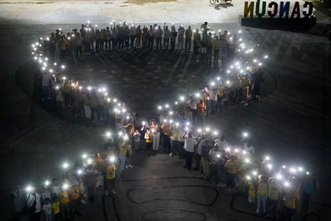 Cancún, Q. R., a 05 de septiembre de 2023.- En el marco del mes de la concientización del Cáncer Infantil, la Presidenta Municipal de Benito Juárez, Ana Patricia Peralta, a través del Sistema para el Desarrollo Integral de la Familia (DIF) Benito Juárez, en coordinación con Fundación Aitana, llevaron a cabo la formación de un lazo humano así como el toque de campanas, a fin de conmemorar a los pacientes pediátricos y adolescentes sobrevivientes y a los que han perdido la batalla contra ésta enfermedad prevenible.