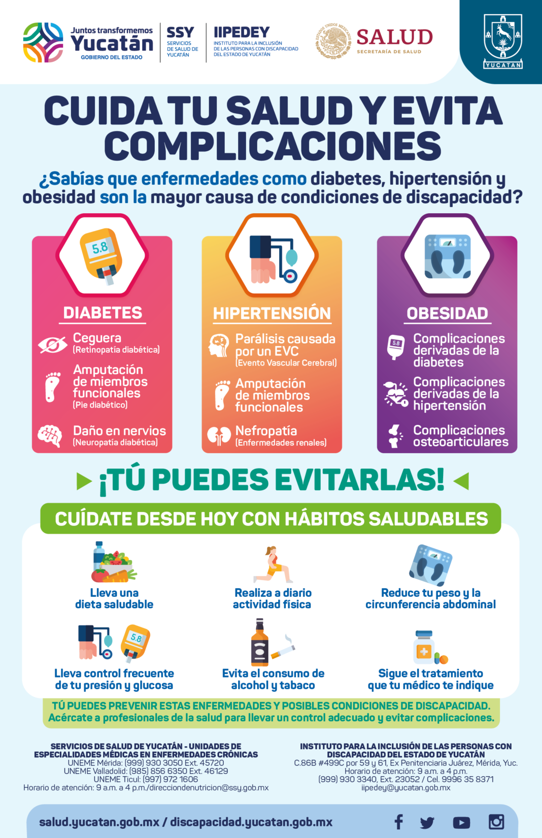 En ese sentido, se puso a disposición los servicios de las Unidades de Especialidades Médicas en Enfermedades Crónicas (Uneme), ubicadas en los municipios de Mérida, Valladolid y Ticul, que atienden de 9:00 a 16:00 horas.