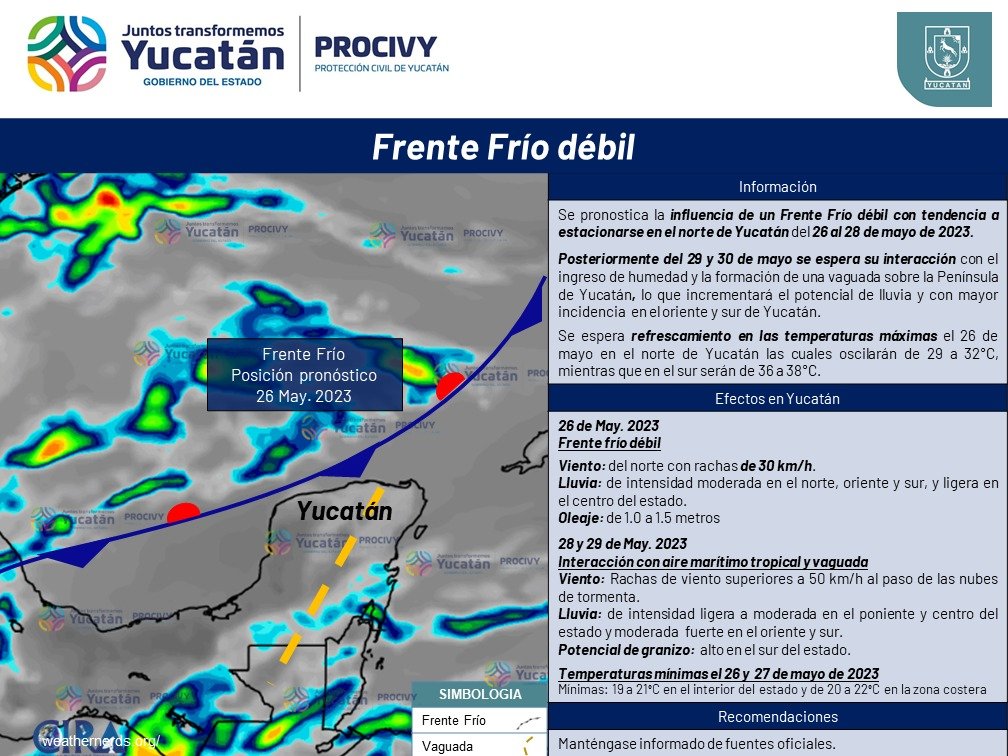 Mérida, Yucatán, 24 de mayo de 2023.- El acercamiento de un nuevo frente frío débil al norte de la Península de Yucatán, probablemente el último de la temporada, a partir este jueves 25, estacionario y con mayor intensidad del 26 al 28, propiciará leve refrescamiento de temperaturas, con potencial de lluvias y posible granizo tanto en el sur como el oriente de la entidad.