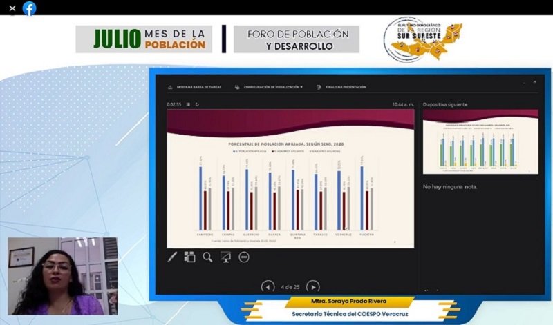 Con la asistencia de quinientos participantes en modalidad virtual y el objetivo de fortalecer la comprensión de los contextos demográficos de la región sur sureste, para posibilitar un equilibrio armónico con mayor equidad, respeto, igualdad y desarrollo en beneficio de la población y del país en su conjunto, dio inicio la segunda sesión del Foro de Población y Desarrollo “El Futuro Demográfico de la Región Sur Sureste”, organizado por el secretario Técnico del Consejo Estatal de Población (COESPO) Sergio Ricardo Leal Gómez, en calidad de coordinador de la Subcomisión Regional Sureste en el marco de celebración del Día Mundial de la Población.