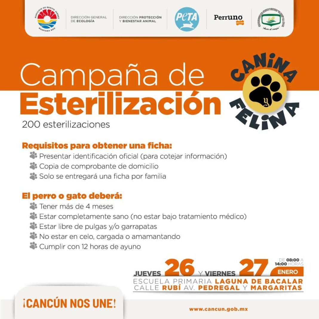 Cancún Q.R., a 25 de enero de 2023.- Con el fin de combatir la fauna callejera, apoyar a las familias cancunenses y sus mascotas, el Ayuntamiento de Benito Juárez, a través de la Dirección de Protección y Bienestar Animal, invita a la ciudadanía a la campaña de esterilización canina y felina que se realizará de forma gratuita el próximo sábado 28 y domingo 29 de enero, con cupo para 200 animales domésticos.