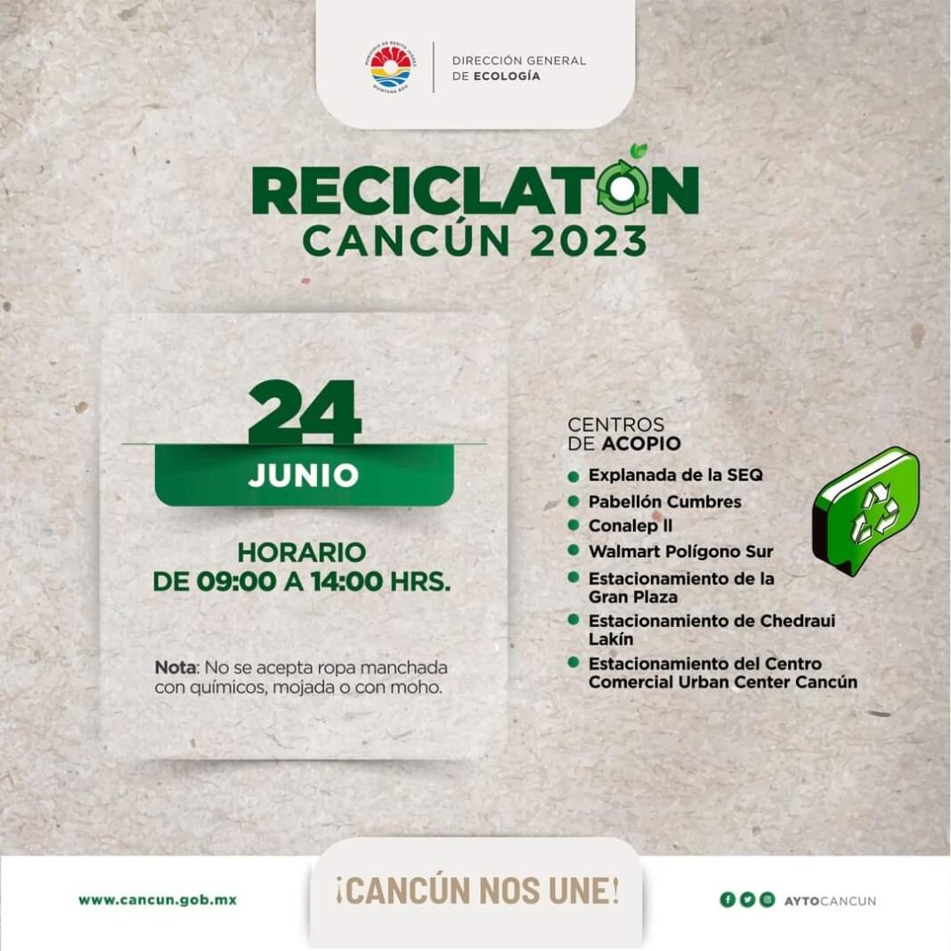 Cancún, Q. R., a 22 de junio de 2023.- El gobierno municipal de Benito Juárez, a través de la Dirección General de Ecología, exhortó a la población para que participen en la décima segunda jornada de “Reciclatón” en el año, la cual se realizará el próximo sábado 24 de junio, con el propósito de que la ciudadanía realice la debida separación de desechos sólidos e ir creando una comunidad responsable con el medio ambiente.