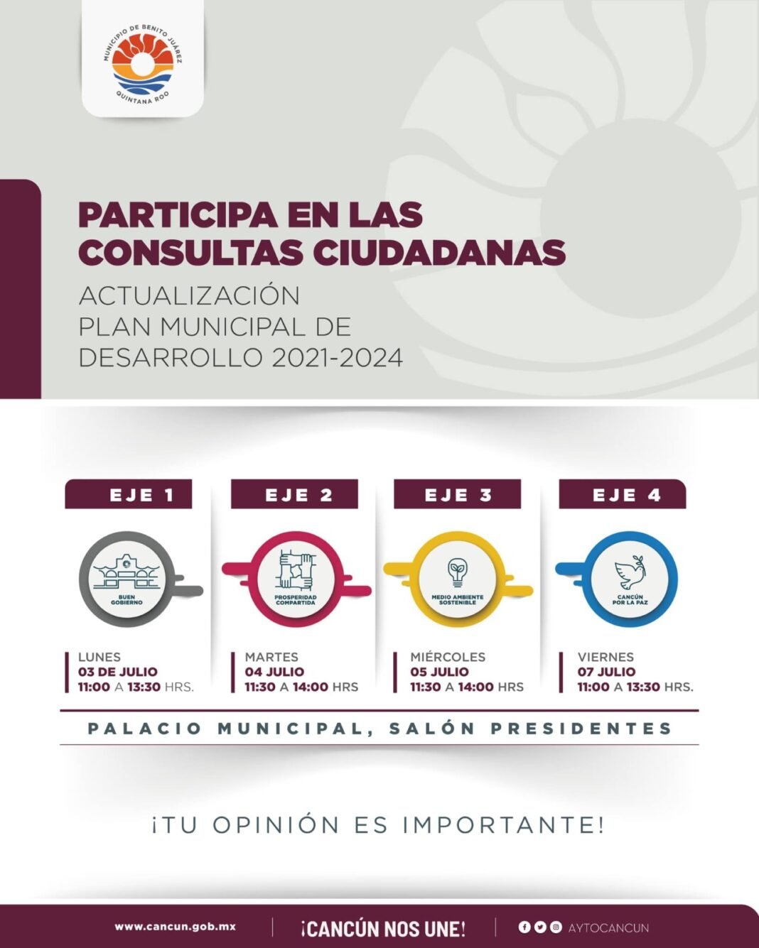En el primer caso, indicó que el “Salón Presidentes” del Palacio Municipal será la sede para la integración de mesas de trabajo con los cancunenses que deseen emitir sus opiniones en los cuatro ejes de dicho documento rector, las cuales se instalarán de la siguiente manera: para el eje “Buen Gobierno”, el lunes 3 de julio, de 11:00 a 13:30 horas; para “Prosperidad Compartida”, el martes 4 de julio, de 11:30 a 14:00 horas; para “Medio Ambiente Sostenible”, el miércoles 5 de julio, de 11:30 a 14:00 horas; y para “Cancún por la Paz”, el próximo viernes 7 de julio, de 11:00 a 13:30 horas.