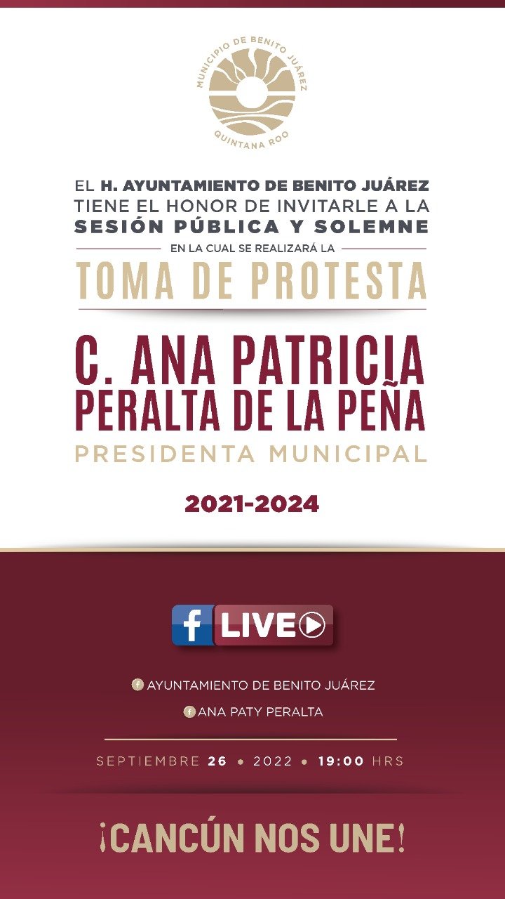 Cancún, Q. R., a 25 de septiembre de 2022.- El Ayuntamiento de Benito Juárez invita a la ciudadanía a atestiguar la toma de protesta de Ana Patricia Peralta de la Peña, como Presidenta Municipal de la administración 2021-2024, misma que se llevará a cabo este lunes 26 de septiembre en punto de las 19:00 horas y se transmitirá en vivo a través de redes sociales.