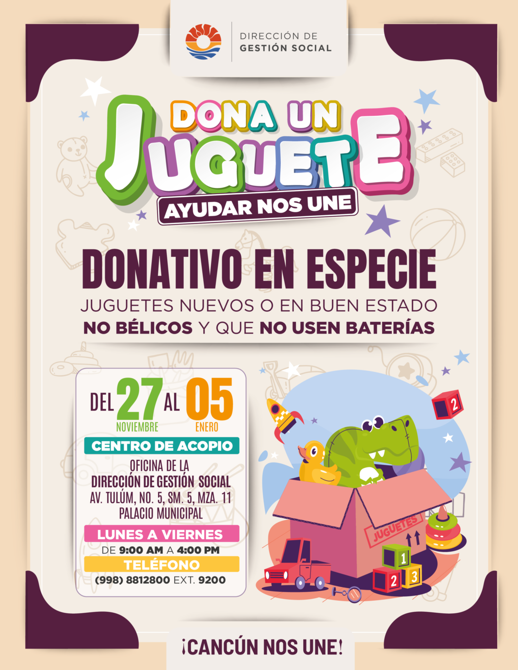 El director de la dependencia, Ricardo Reyes Quintero, señaló que la finalidad de estas donaciones es hacer felices a las y los niños cancunenses, con un juguete nuevo o en buen estado, que no sea bélico y no requiera baterías, los cuales se estarán recibiendo hasta el 5 de enero.