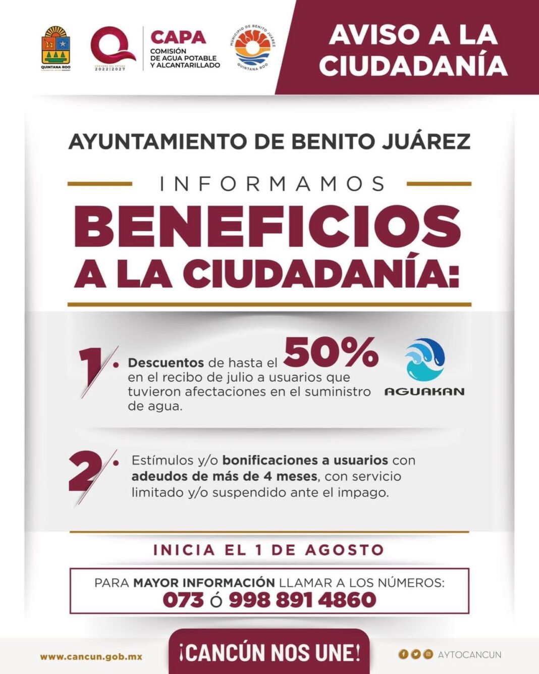 Se recuerda que a partir del 1 de agosto próximo, derivado de las negociaciones entre el gobierno municipal y el corporativo, así como el exhorto emitido por parte del Cabildo de Benito Juárez, se ofrecerá hasta el 50% de descuentos a usuarios que tuvieron afectaciones en la dotación del suministro de agua, así como facilidades para brindar estímulos y/o bonificaciones a usuarios con adeudos de más de 4 meses, con servicio limitado y/o suspendido ante el impago.